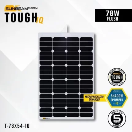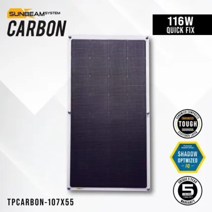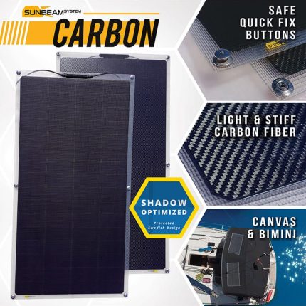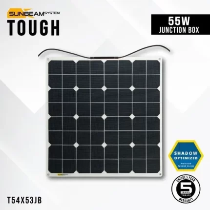 Το νέο ηλιακό πανελ 55 Watt Tough από το SUNBEAM system είναι ένα ηλιακό πάνελ που μπορεί να περπατηθεί και να λυγίσει έως και 15 μοίρες. Η κομψή μαύρη επιφάνεια αυτής της έκδοσης Black φαίνεται υπέροχη σε τικ, χρωματιστά καταστρώματα ή σκάφη με μοντέρνα εμφάνιση. Όσον αφορά το μέγεθος, αυτό το μοντέλο ταιριάζει απόλυτα στην οροφή του γκαράζ (sprayhood) σε πολλά ιστιοφόρα. Εξοπλισμένο με αντιολισθητική επιφάνεια και επιπλέον ανθεκτική στην υπεριώδη ακτινοβολια για εξαιρετικά μεγάλη διάρκεια ζωής. Αυτός είναι ο λόγος που συνοδεύεται από εγγύηση 5 ετών. Χάρη στα πολύ αποδοτικά (> 22,5%) ηλιακά κύτταρα της Sunpower, αυτό το πάνελ είναι κατά μέσο όρο 30% μικρότερο από άλλα πάνελ ισοδύναμης ισχύος. Το πλαίσιο είναι εξαιρετικά ελαφρύ στα 1000 γραμμάρια και έχει διαστάσεις 54,5 x 53,5 cm.